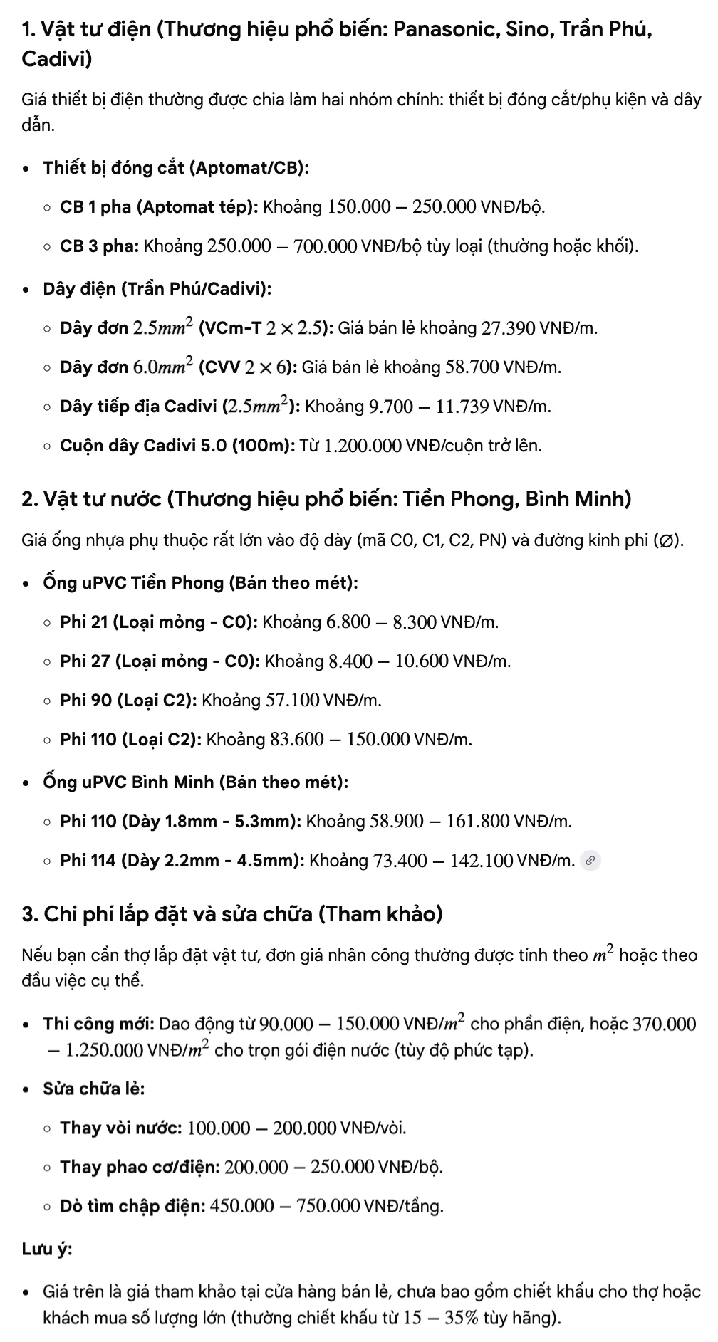 Trước khi mua vật tư, nên tham khảo bảng giá từ nhiều cửa hàng khác nhau để có cái nhìn tổng quan về thị trường.