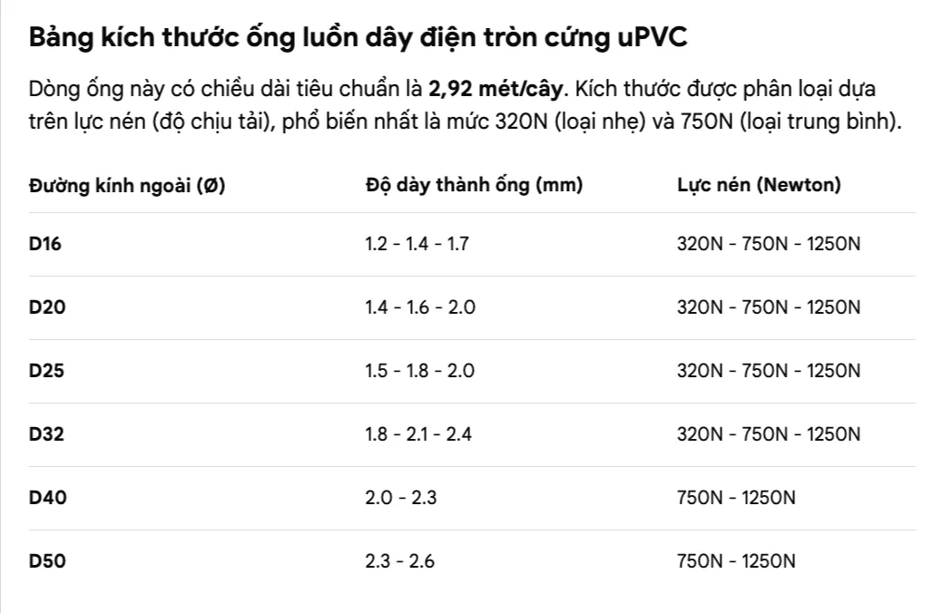 Ảnh minh hoạ: Bảng kích thước ống luồn dây điện PVC Tiền Phong