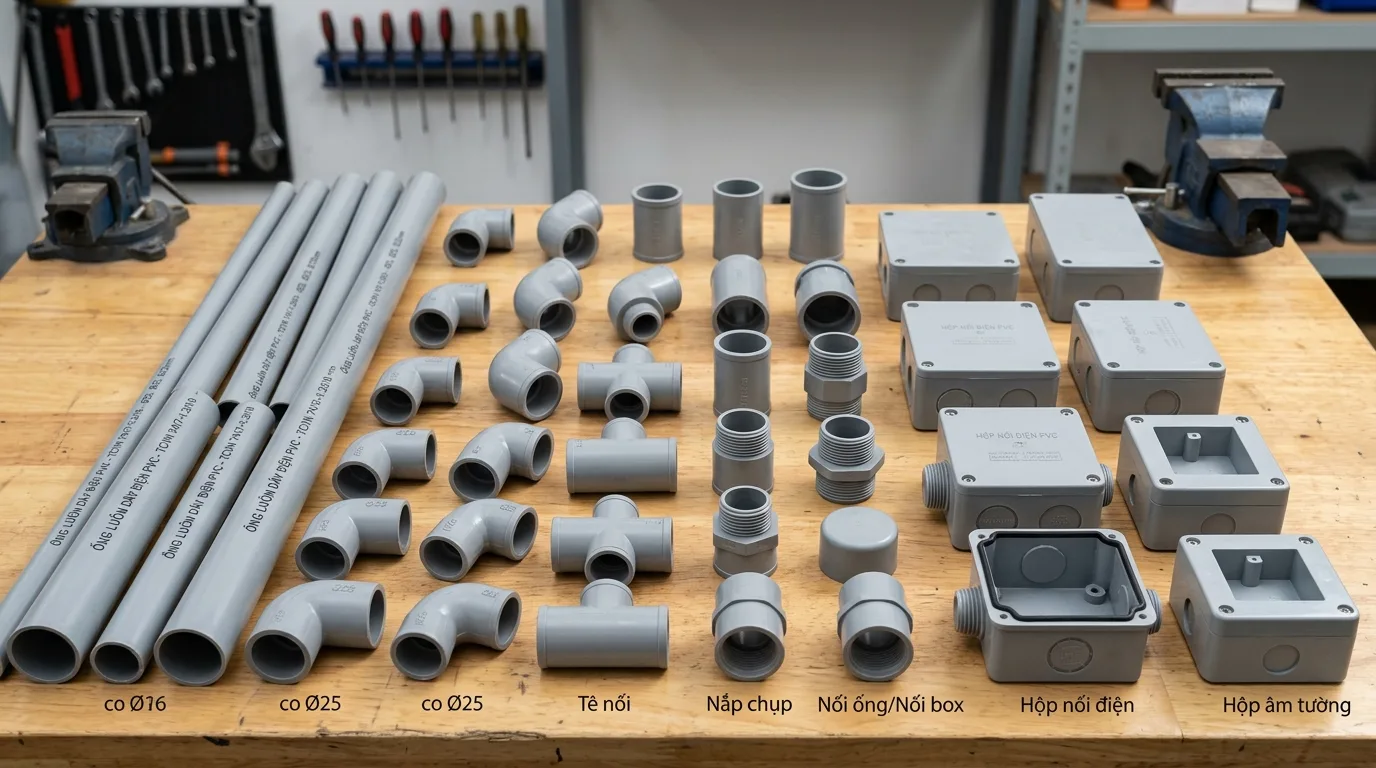 Ngoài ống điện, hệ thống thi công còn cần nhiều loại phụ kiện để kết nối và cố định đường ống. Các phụ kiện này giúp hệ thống đi dây điện gọn gàng và đảm bảo kỹ thuật.