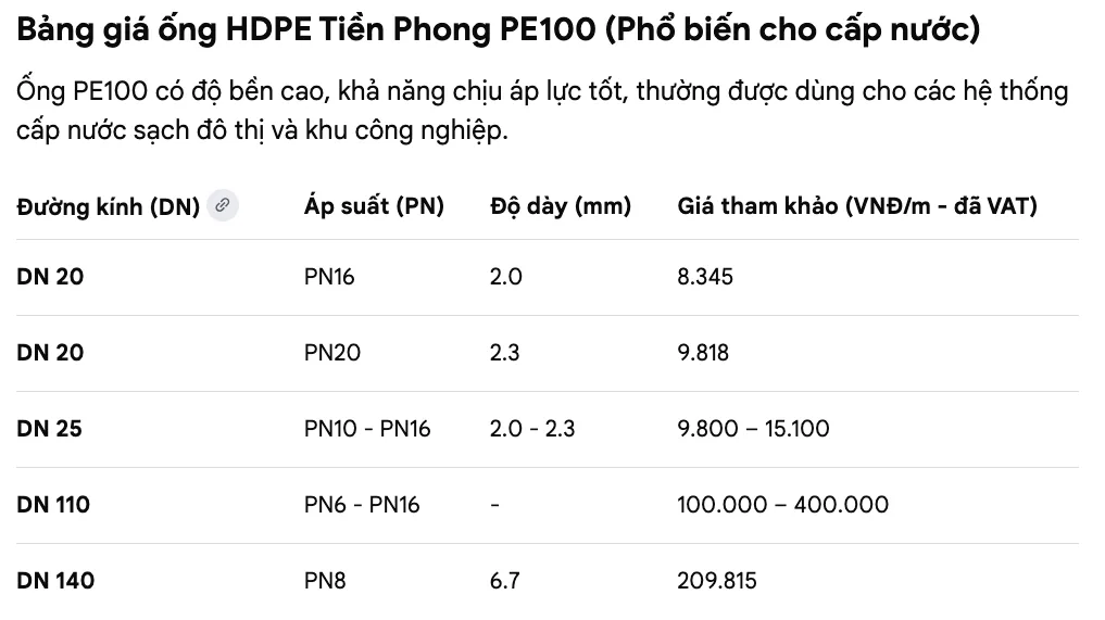 Việc tham khảo bảng giá và lựa chọn đúng loại ống giúp đảm bảo hệ thống cấp nước vận hành ổn định, đồng thời giảm thiểu chi phí vật tư cho toàn bộ công trình.