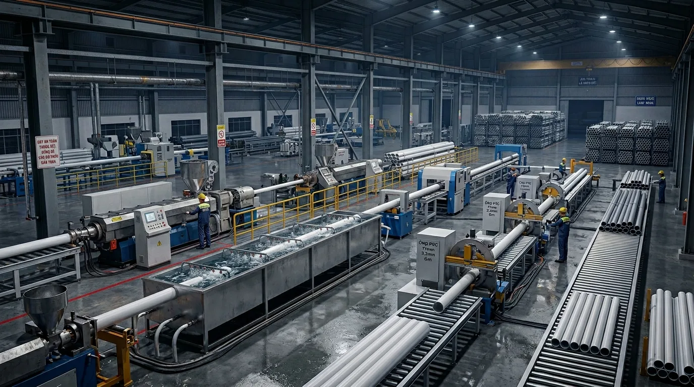 Ảnh minh hoạ: Dây chuyền sản xuất ống nhựa PVC trong nhà máy