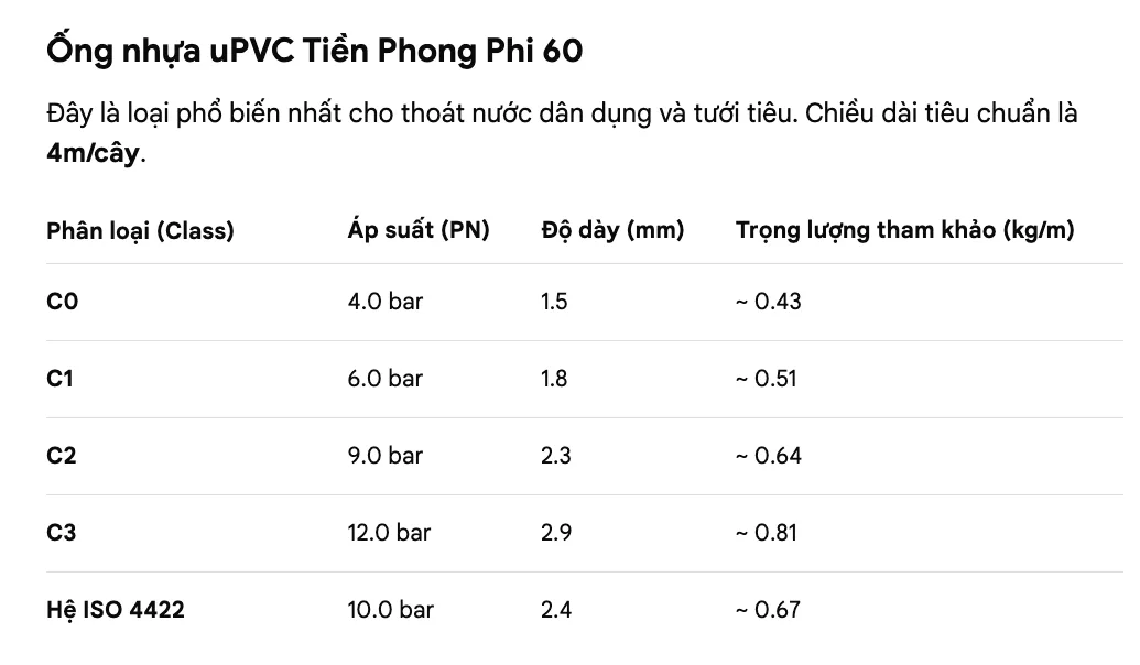 Ống nhựa PVC Tiền Phong phi 60 thường được sản xuất theo các tiêu chuẩn phổ biến như C1, C2 và C3. Mỗi tiêu chuẩn thể hiện độ dày thành ống và khả năng chịu áp lực của sản phẩm.