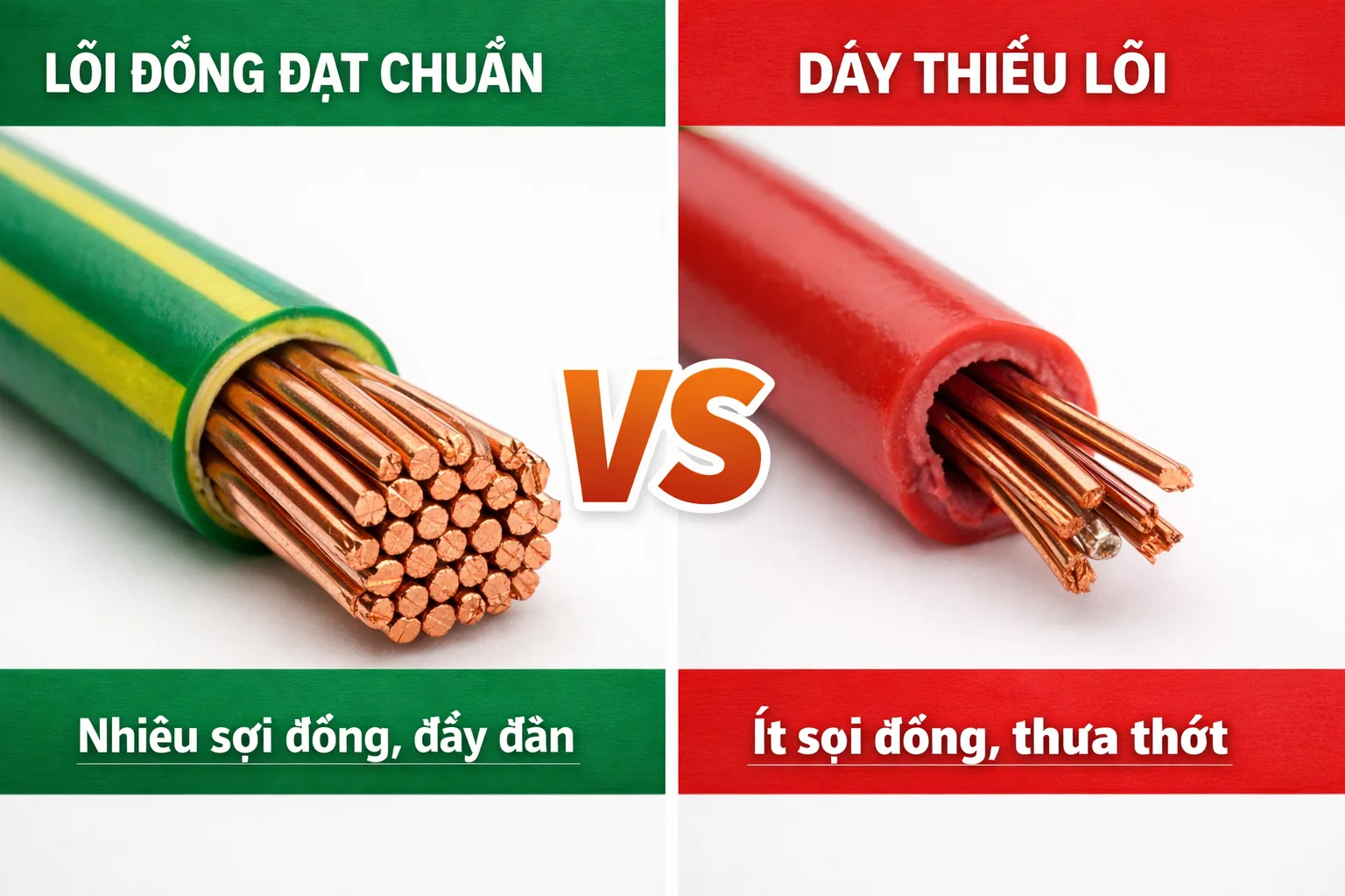 Sự chênh lệch này đến từ lượng đồng thực tế bên trong. Dây thiếu lõi thường: